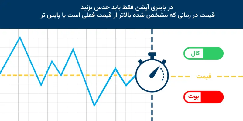 توجه داشته باشید که معاملات باینری آپشن به دلیل سادگی و وضوح در ساختار، برای برخی از سرمایهگذاران جذاب است. در تصویر زیر برای شما نحوه عملکرد باینری آپشن را بطور کامل و تصویری توضیح داده ایم: