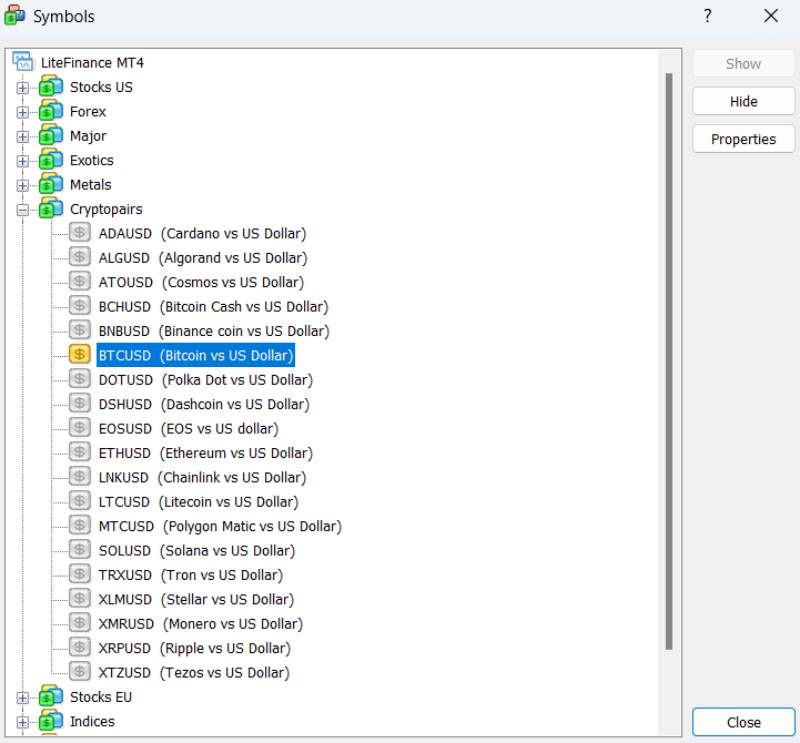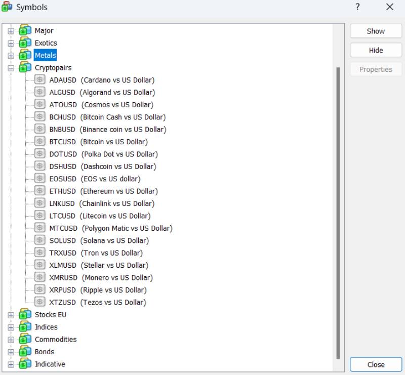 به این نکته توجه داشته باشید که برخی از بروکر ها یا حساب ها از نمادهای کریپتو پشتیبانی نمی کنند و اگر شما وارد بخش Symbols شدید و گزینه Cryptocurrencies وجود نداشت، به این معنی است که این حساب از ارز دیجیتال پشتیبانی نمیکند.