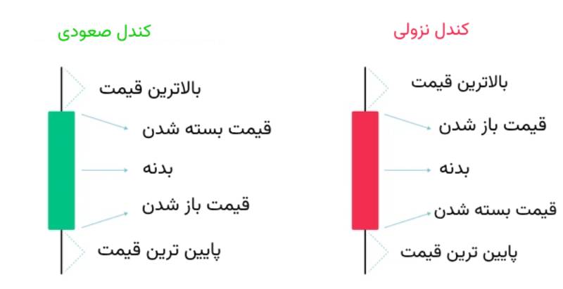 - بدنه (Body): اختلاف بین قیمت باز (Open) و قیمت بسته (Close) را نشان میدهد.