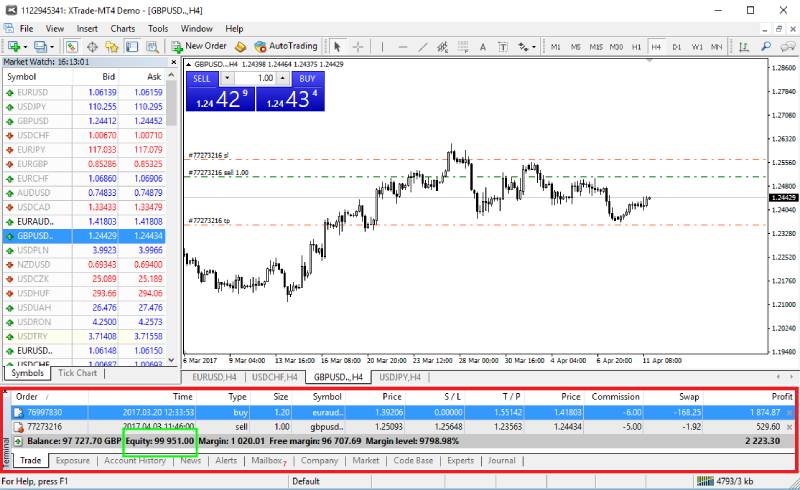همانطور که مشاهده میکنید در این معامله بالانس برابر با 97 هزار دلار است و معاملات باز نیز جمعا 2 هزار دلار سود داشته اند که مقدار اکوئیتی آن برابر 99 هزار دلار شده است.