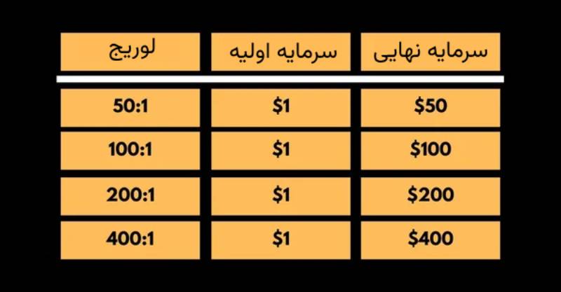 | 20:1 | 5% | لوریج بالا؛ نیاز به مدیریت ریسک دقیق. |