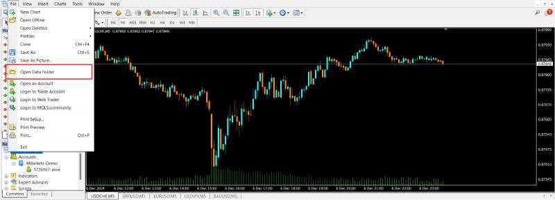 ابتدا وارد متاتریدر خود شوید و از تب File گزینه Open Data Folder را بزنید.