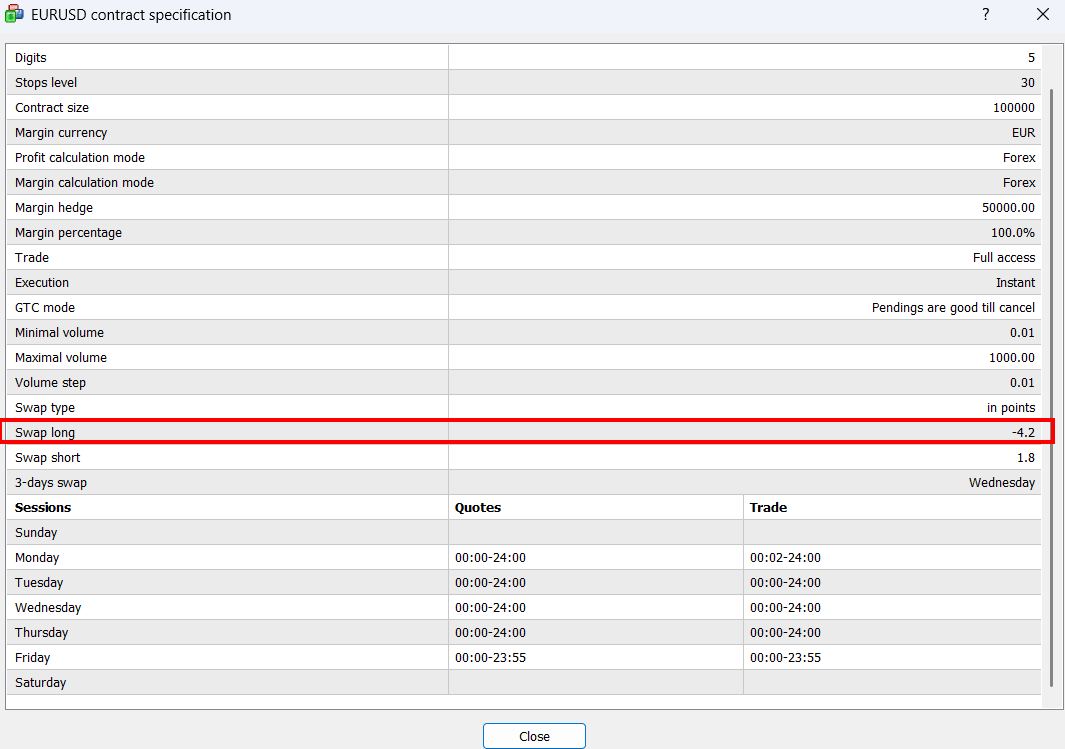 در صفحه ای که برای شما باز میشود میتوانید تمام اطلاعات نماد را مشاهده کنید. در تصویر زیر swap long را مشخص کرده ایم.