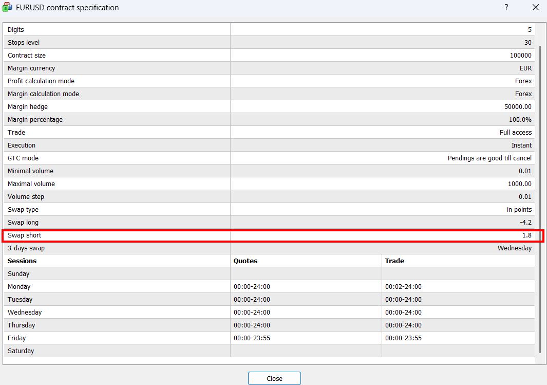 در پنجره بازشده، اطلاعات کامل مربوط به نماد، از جمله Swap Short نمایش داده میشود.