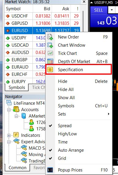 برای مشاهده سواپ شورت در متاتریدر روی نماد مورد نظر راست کلیک کنید و گزینه Specification را انتخاب کنید.