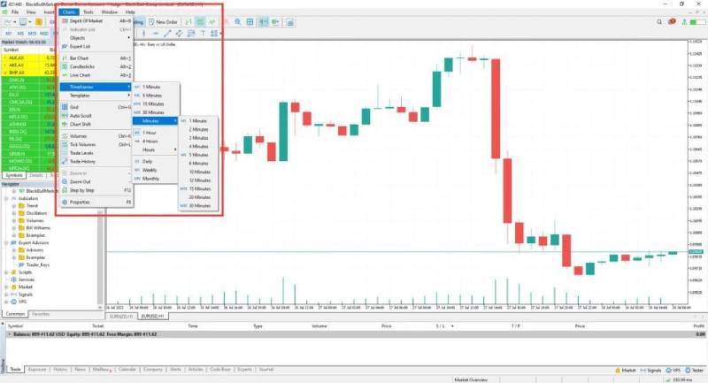 برای اینکه بتوانید تایم فریم خود را در متاتریدر مشاهده کنید، وارد پلتفرم متاتریدر شوید و از بخش مشخص شده در تصویر زیر تایم فریم خود را مشاهده میکنید و حتی میتوانید آن را تغییر دهید: